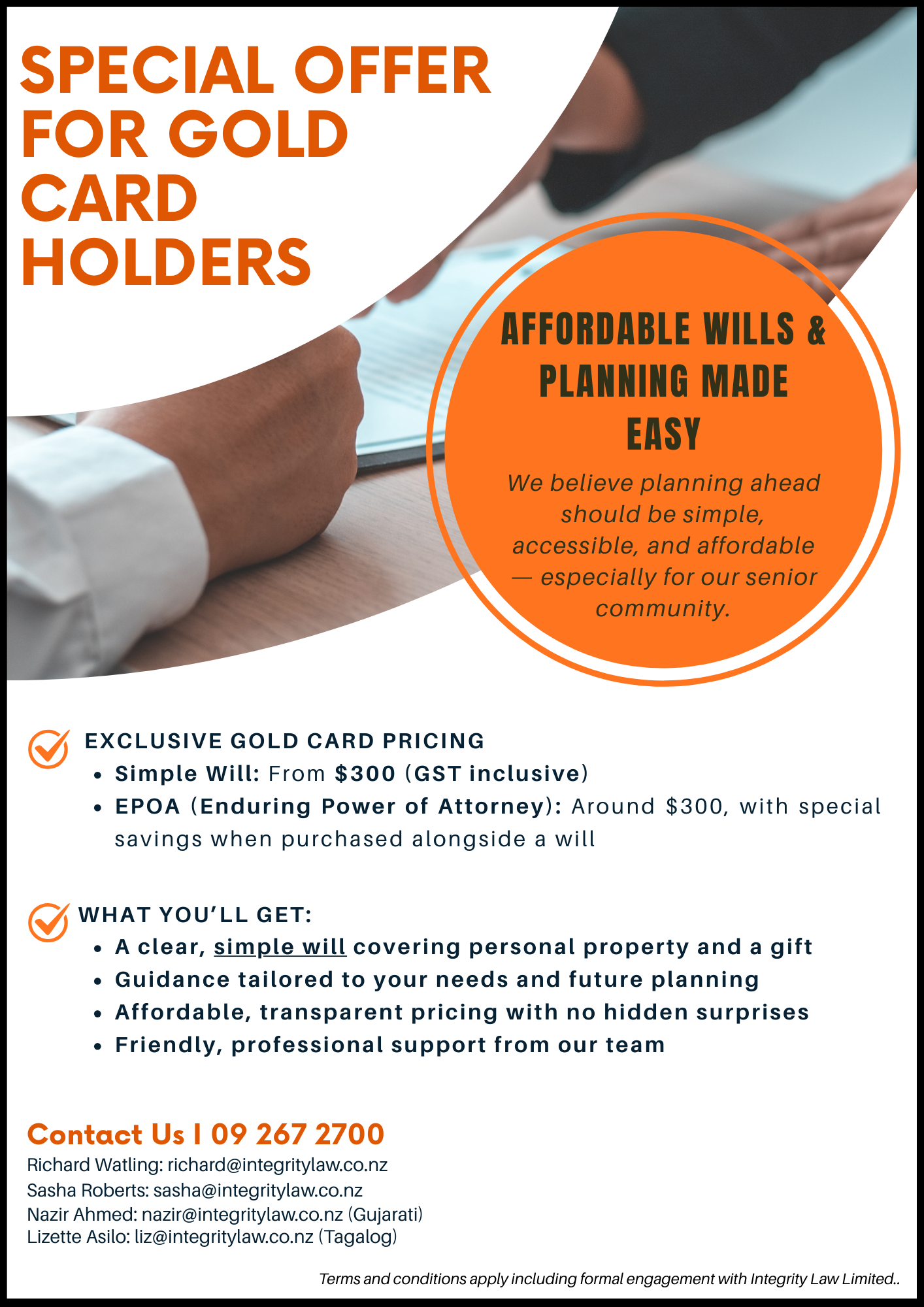 We’re proud to offer a special promotion exclusively for Gold Card holders. Planning ahead should be simple, accessible, and affordable, especially for our senior community. Our team at Integrity Law is here to make the process clear, stress‑free, and tailored to your needs.