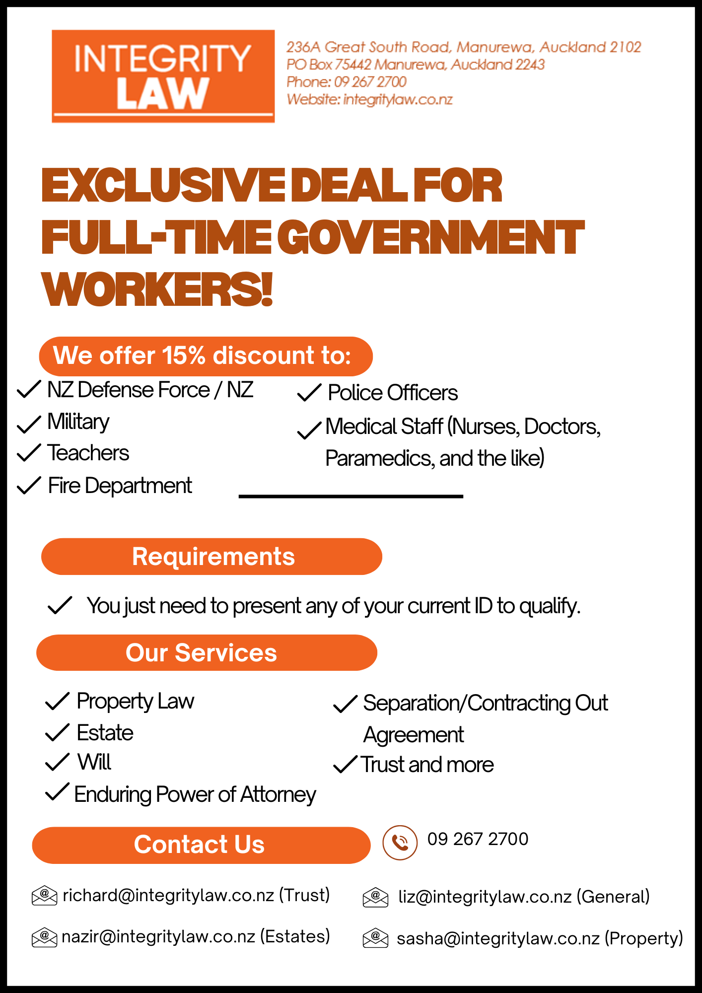 We’re offering an exclusive 15% discount to support the hardworking members of our government and public service sectors. This special offer applies to a wide range of essential legal services and is available to full‑time government employees.